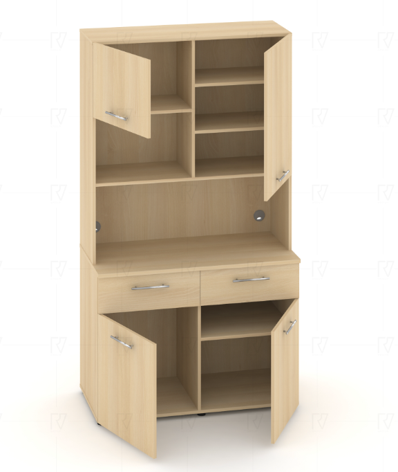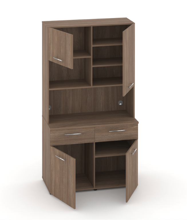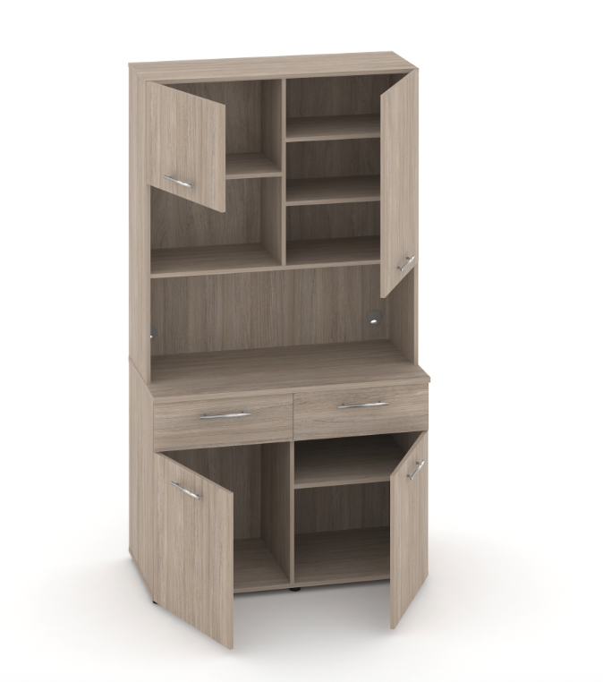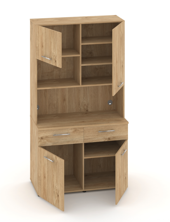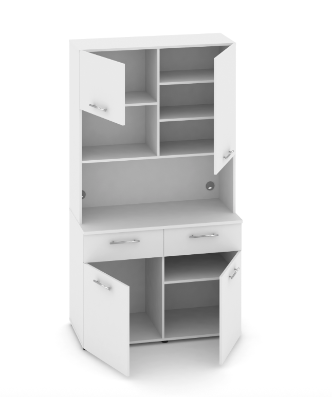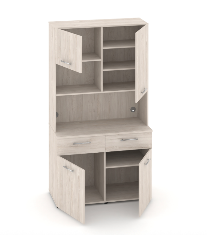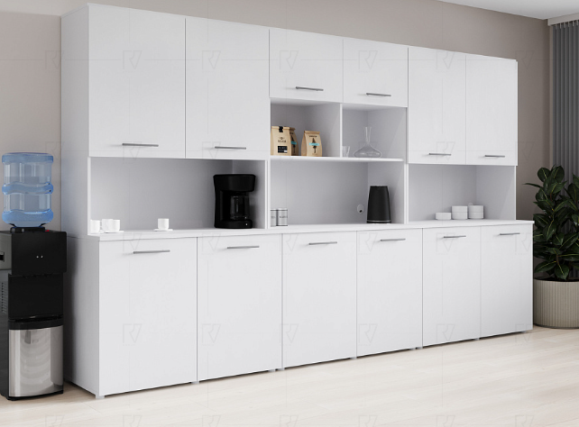 Фасады антресоли накладные, фасады тумбы накладные и вкладные под столешницу в кромке 2мм. тУстанавливаемые полки, с жестким креплением на рафиксы, являются съемными, перфорация на стойках под полки с шагом 64мм.