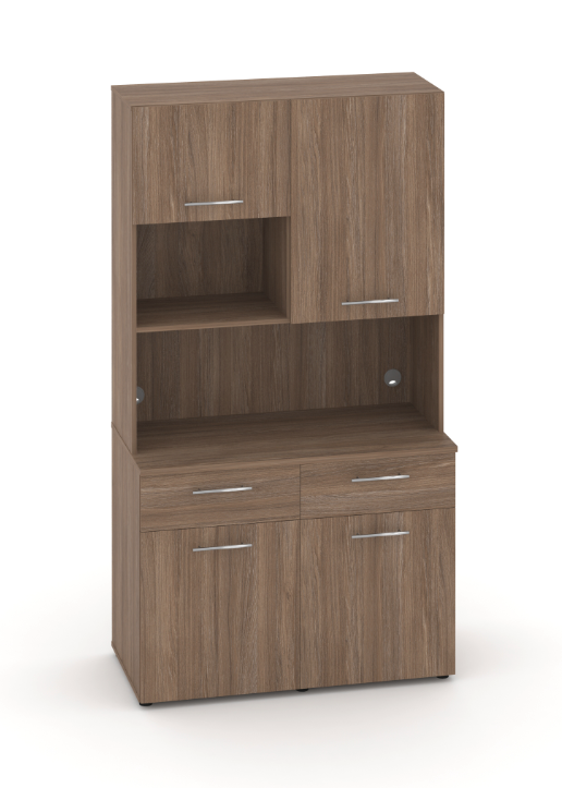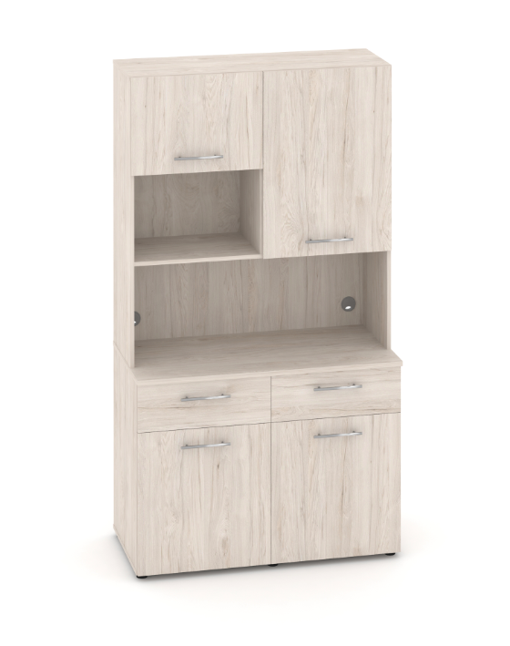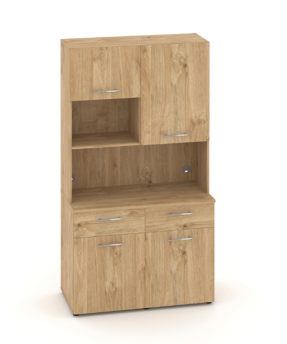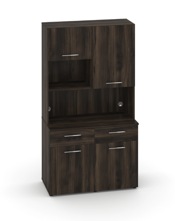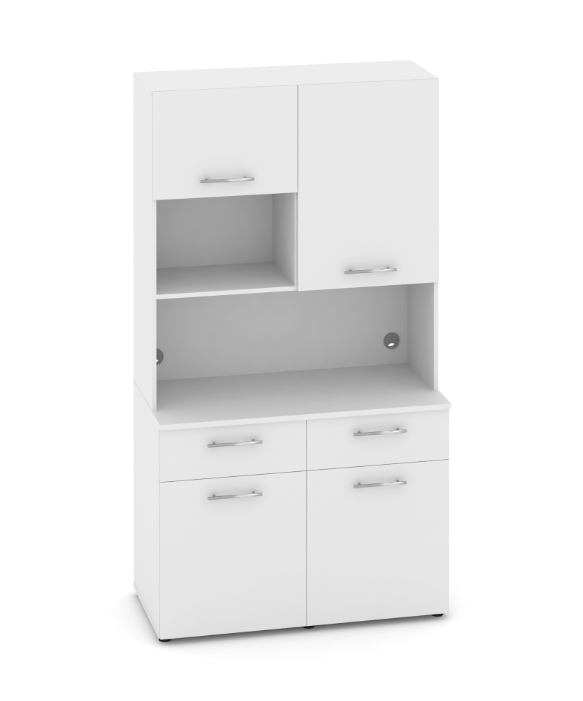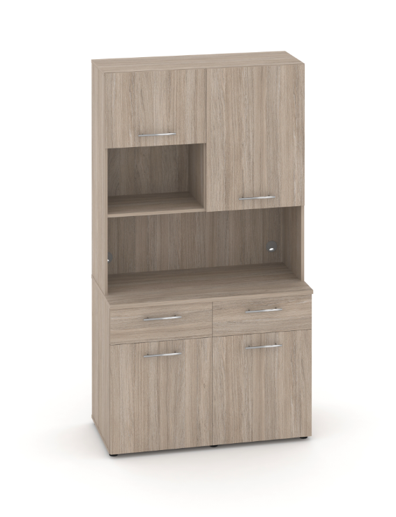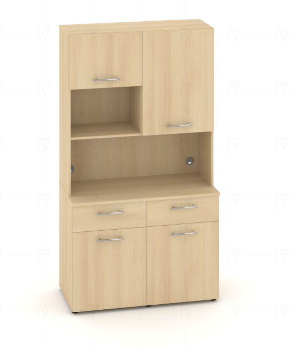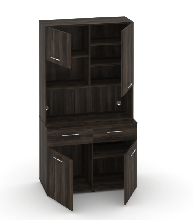 Фасады антресоли накладные, фасады тумбы накладные и вкладные под столешницу в кромке 2мм. тУстанавливаемые полки, с жестким креплением на рафиксы, являются съемными, перфорация на стойках под полки с шагом 64мм.