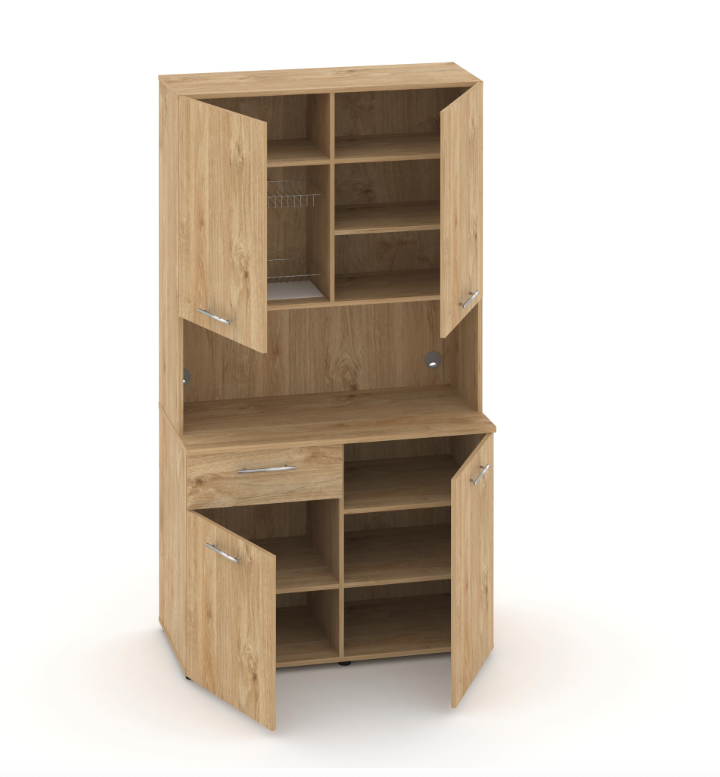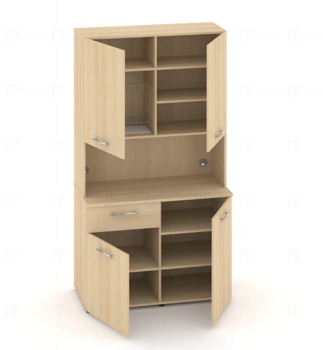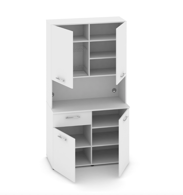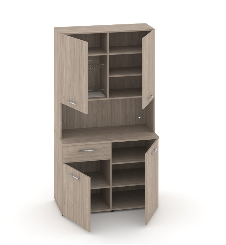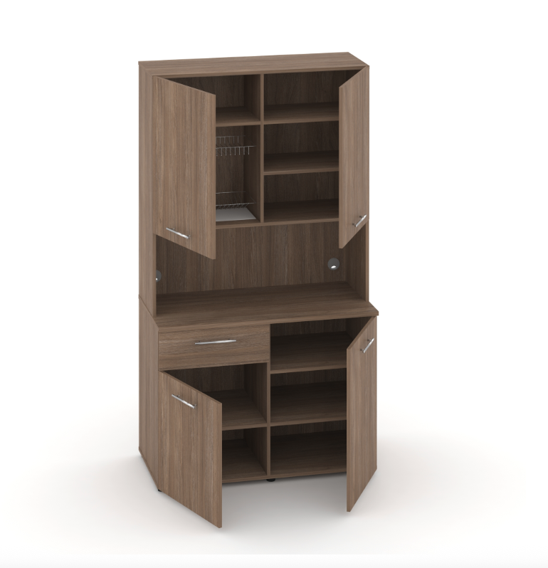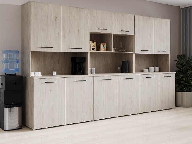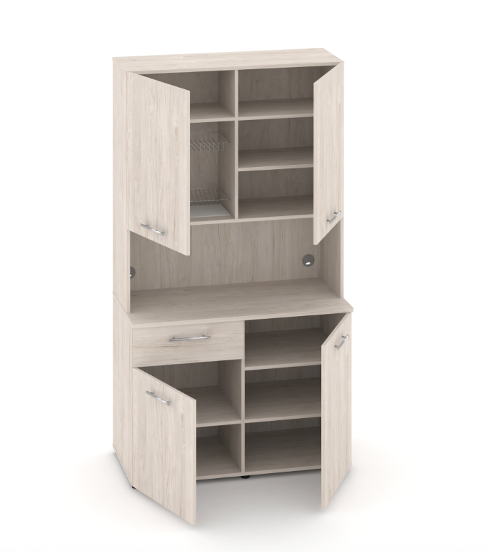 Фасады антресоли накладные, фасады тумбы накладные и вкладные под столешницу в кромке 2мм. тУстанавливаемые полки, с жестким креплением на рафиксы, являются съемными, перфорация на стойках под полки с шагом 64мм.