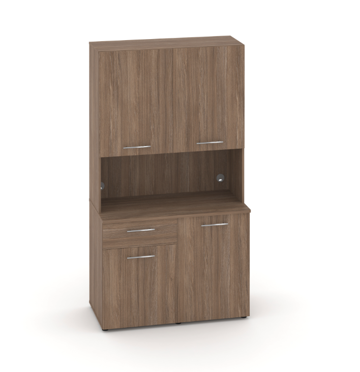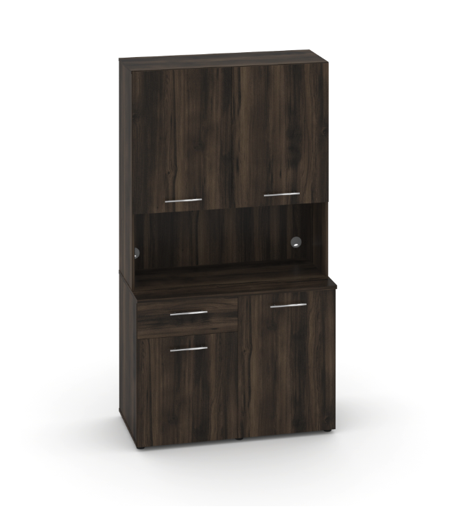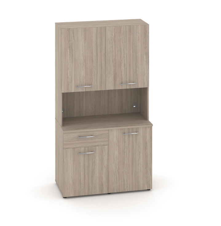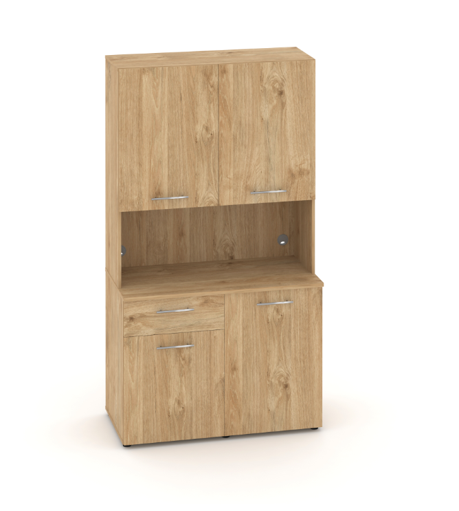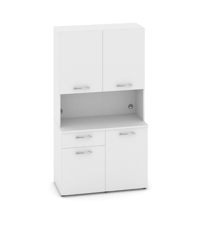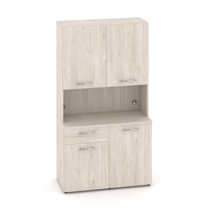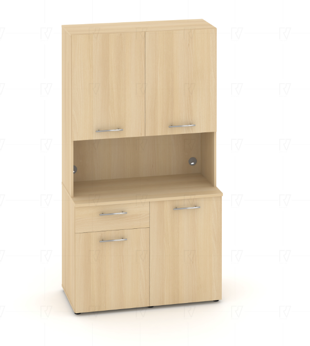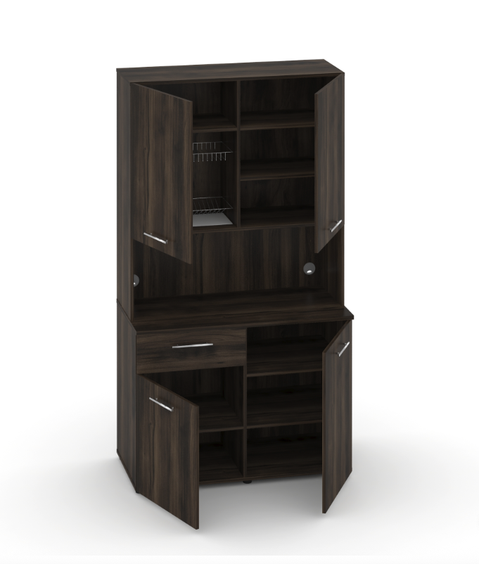 Фасады антресоли накладные, фасады тумбы накладные и вкладные под столешницу в кромке 2мм. тУстанавливаемые полки, с жестким креплением на рафиксы, являются съемными, перфорация на стойках под полки с шагом 64мм.