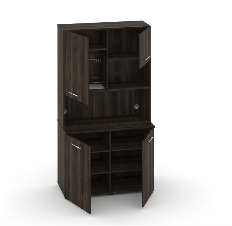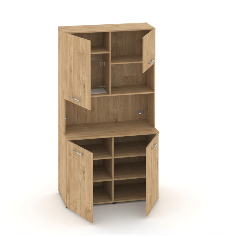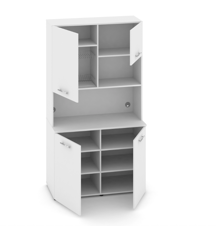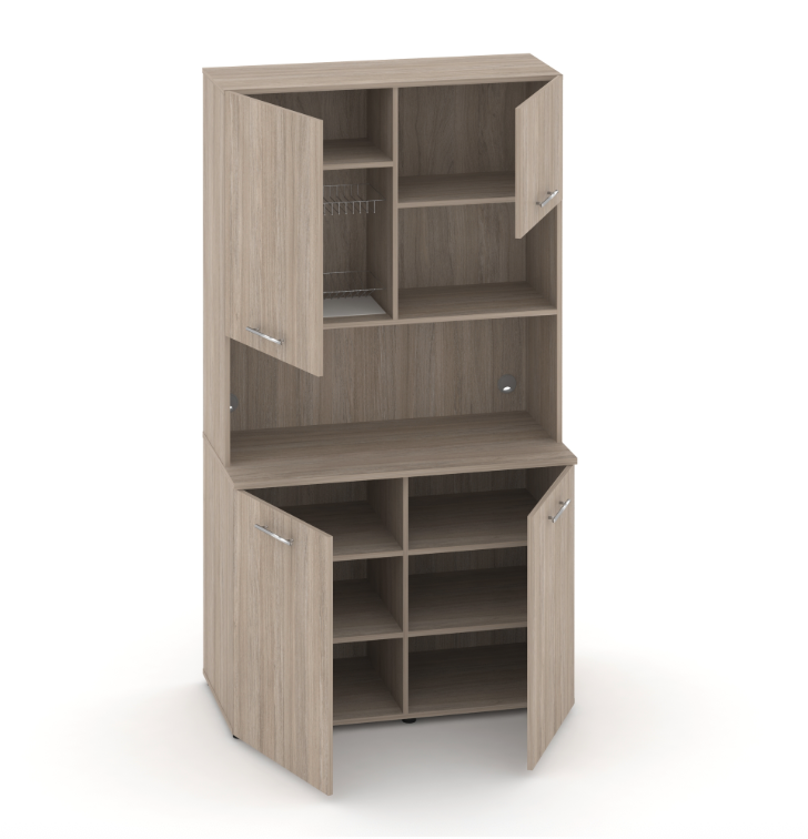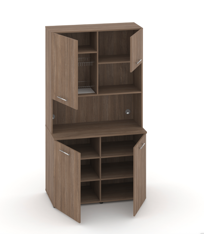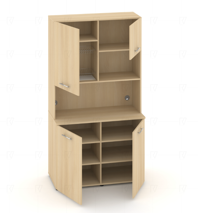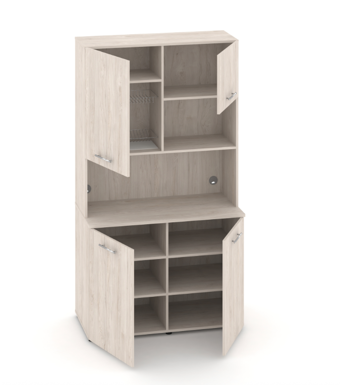 Фасады антресоли накладные, фасады тумбы накладные и вкладные под столешницу в кромке 2мм. тУстанавливаемые полки, с жестким креплением на рафиксы, являются съемными, перфорация на стойках под полки с шагом 64мм.