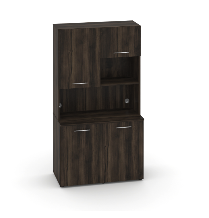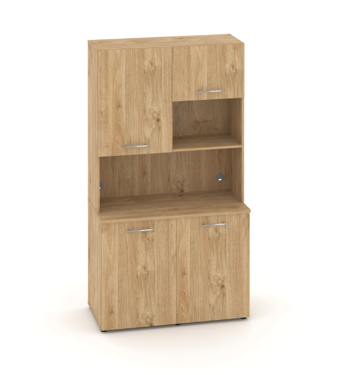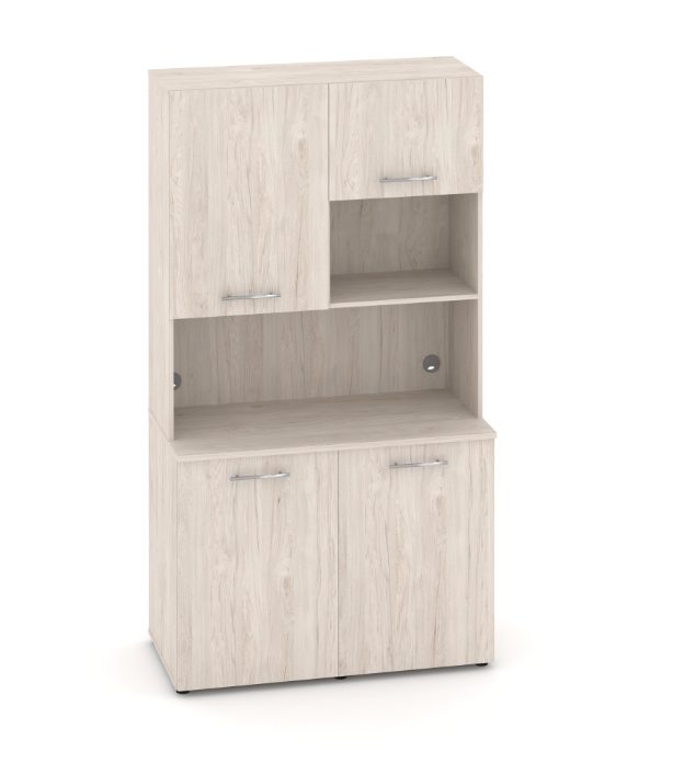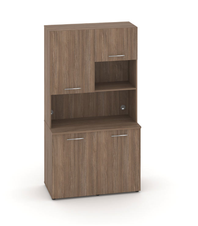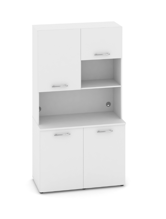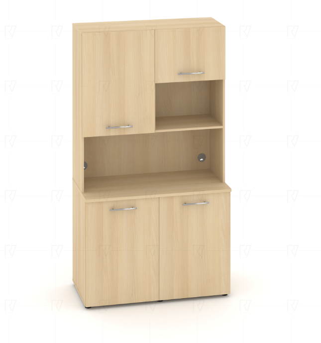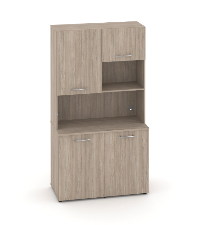 Фасады антресоли накладные, фасады тумбы накладные и вкладные под столешницу в кромке 2мм. тУстанавливаемые полки, с жестким креплением на рафиксы, являются съемными, перфорация на стойках под полки с шагом 64мм.