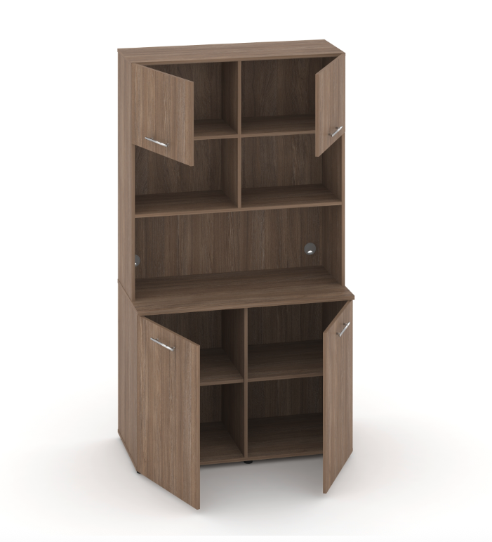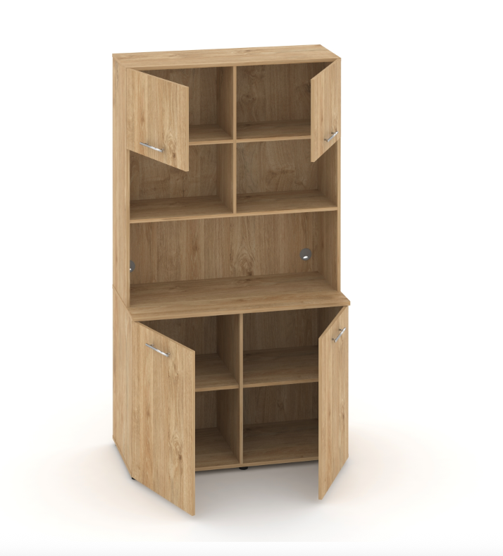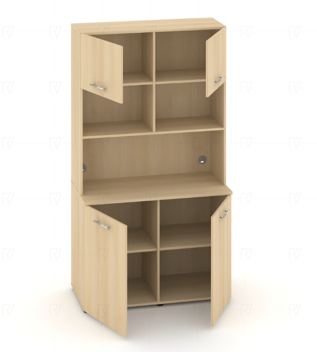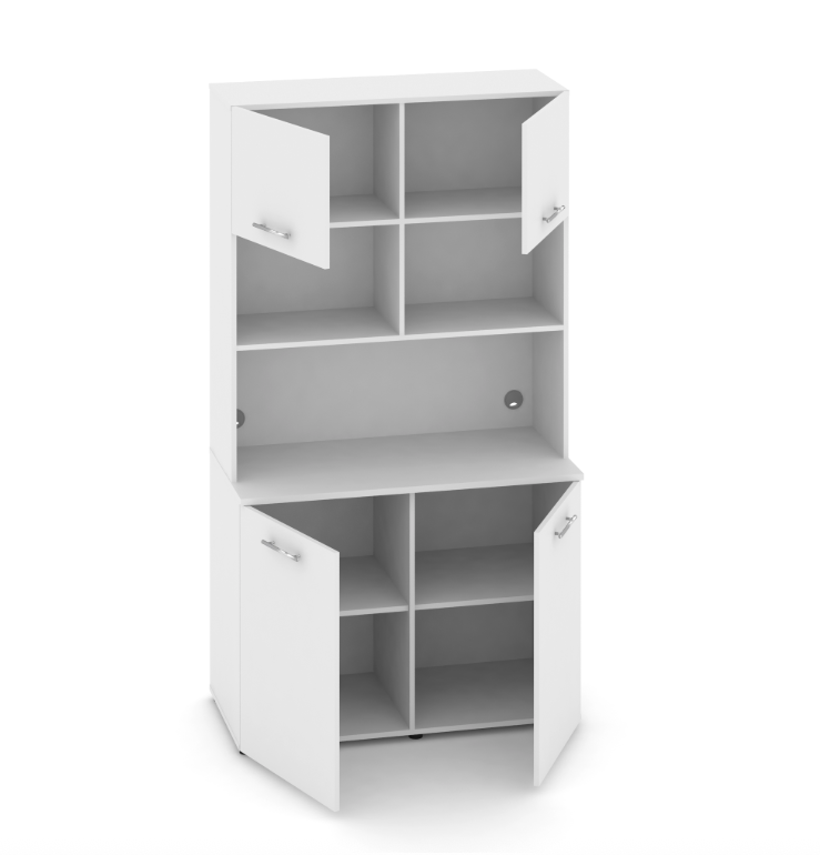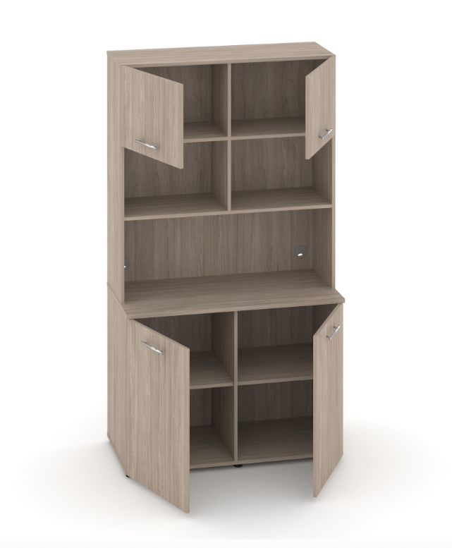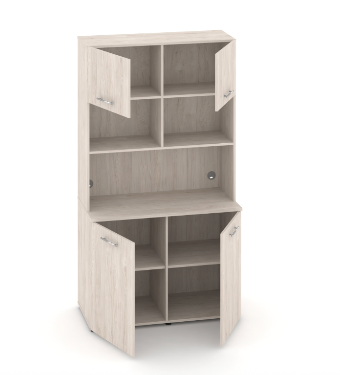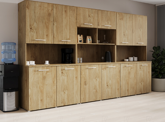 Фасады антресоли накладные, фасады тумбы накладные и вкладные под столешницу в кромке 2мм. тУстанавливаемые полки, с жестким креплением на рафиксы, являются съемными, перфорация на стойках под полки с шагом 64мм.