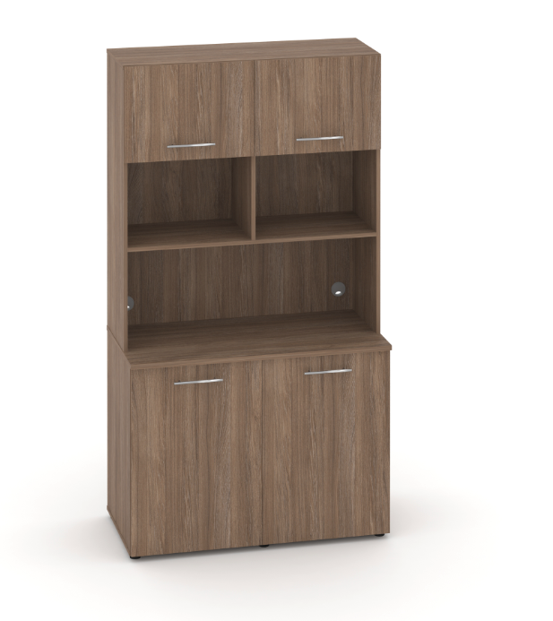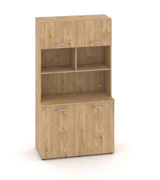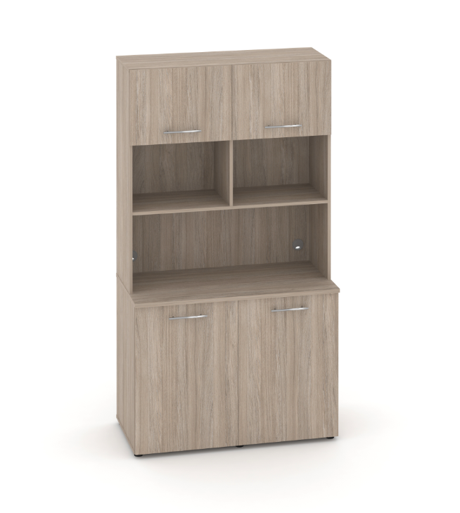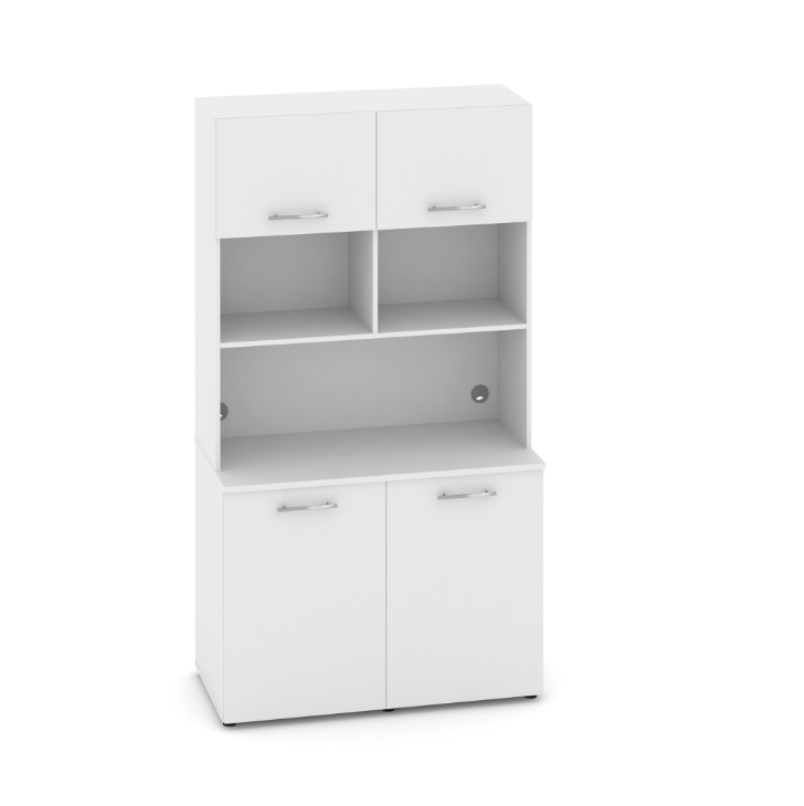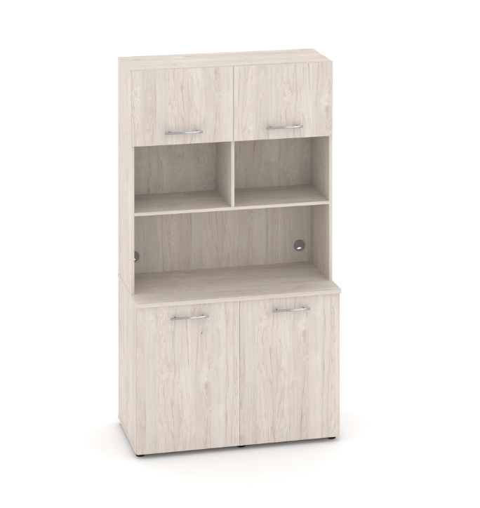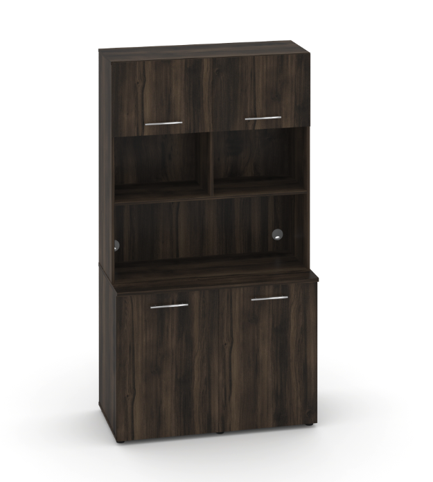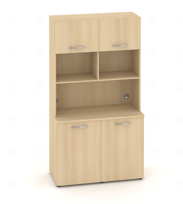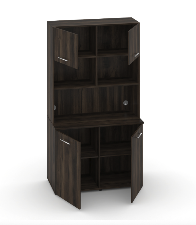 Фасады антресоли накладные, фасады тумбы накладные и вкладные под столешницу в кромке 2мм. тУстанавливаемые полки, с жестким креплением на рафиксы, являются съемными, перфорация на стойках под полки с шагом 64мм.