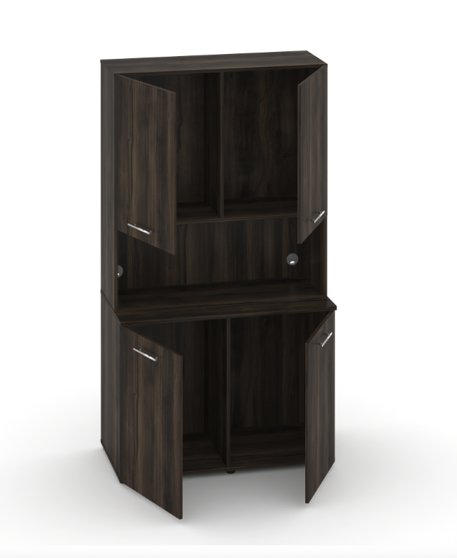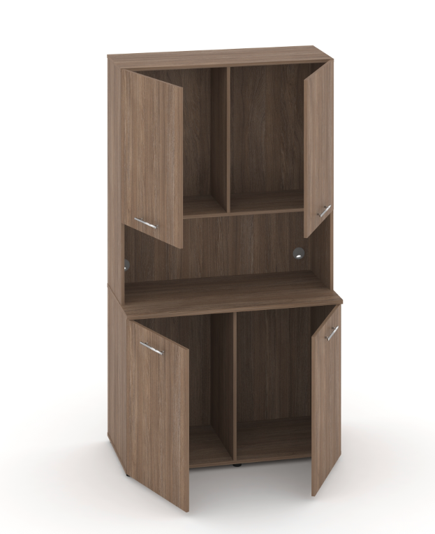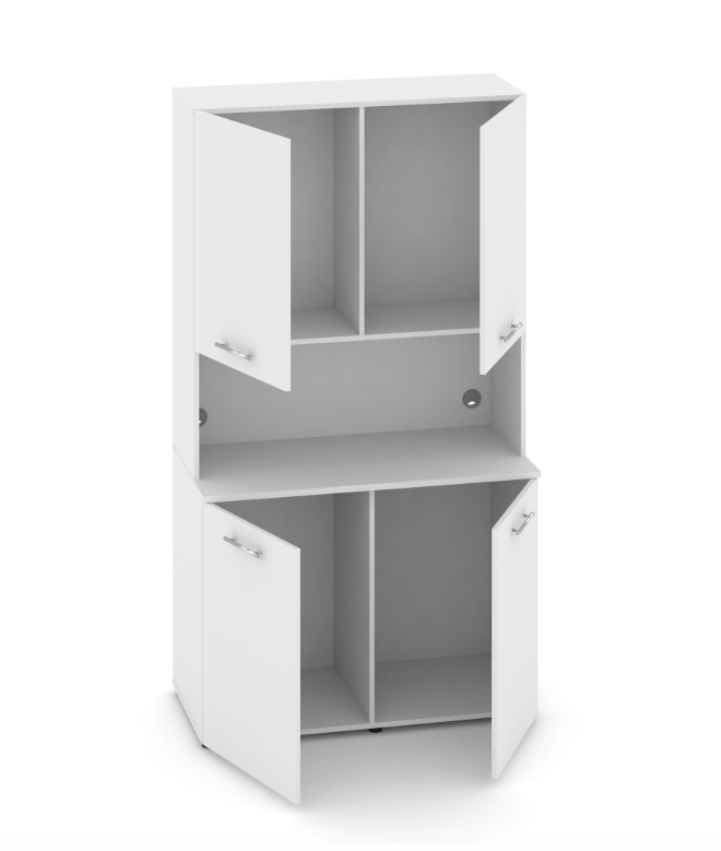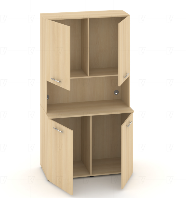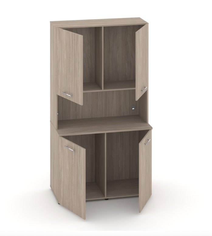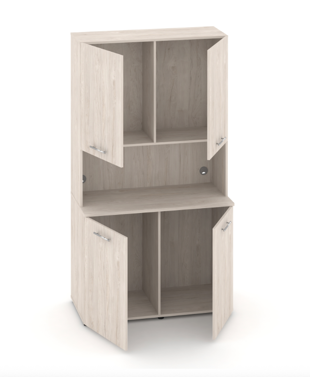 Фасады антресоли накладные, фасады тумбы накладные и вкладные под столешницу в кромке 2мм. тУстанавливаемые полки, с жестким креплением на рафиксы, являются съемными, перфорация на стойках под полки с шагом 64мм.