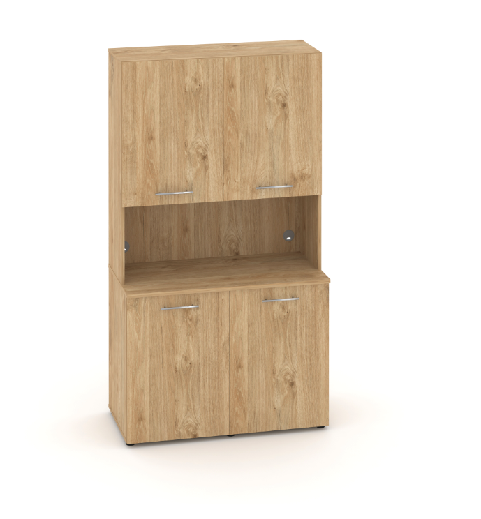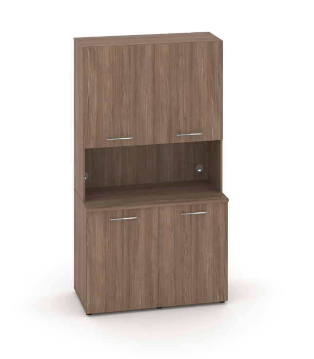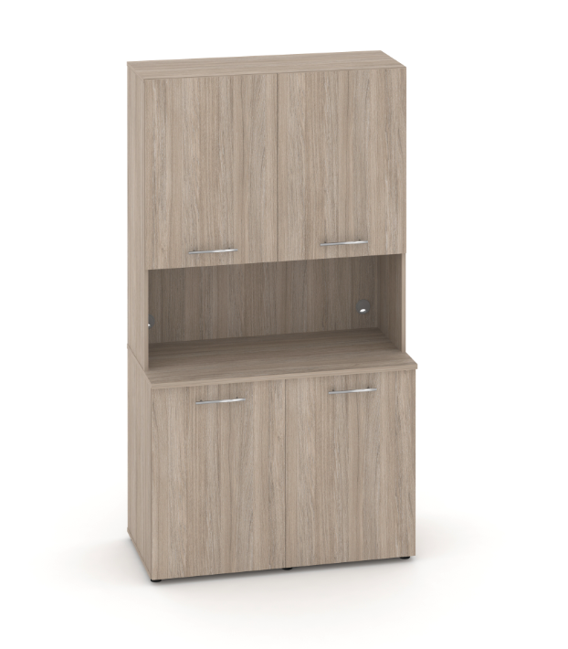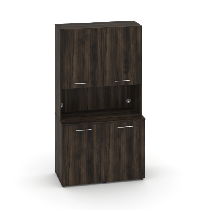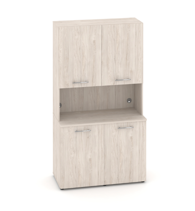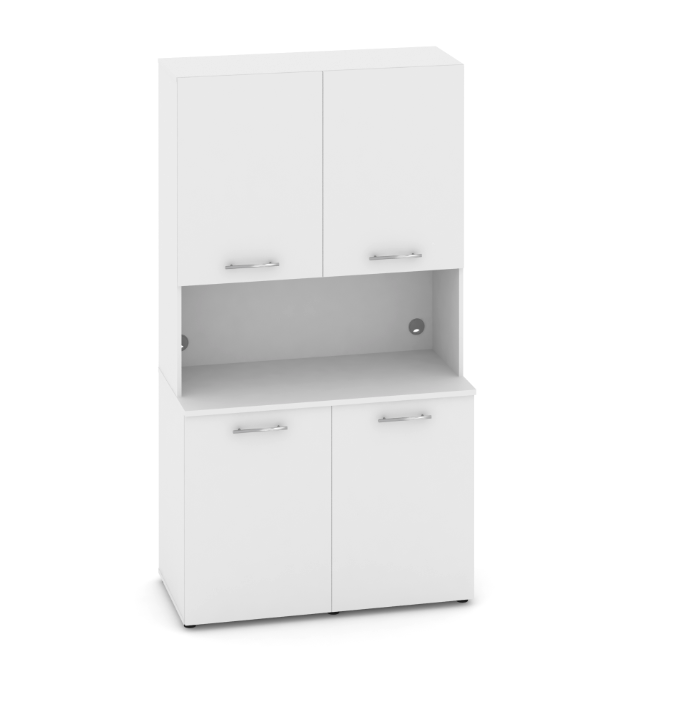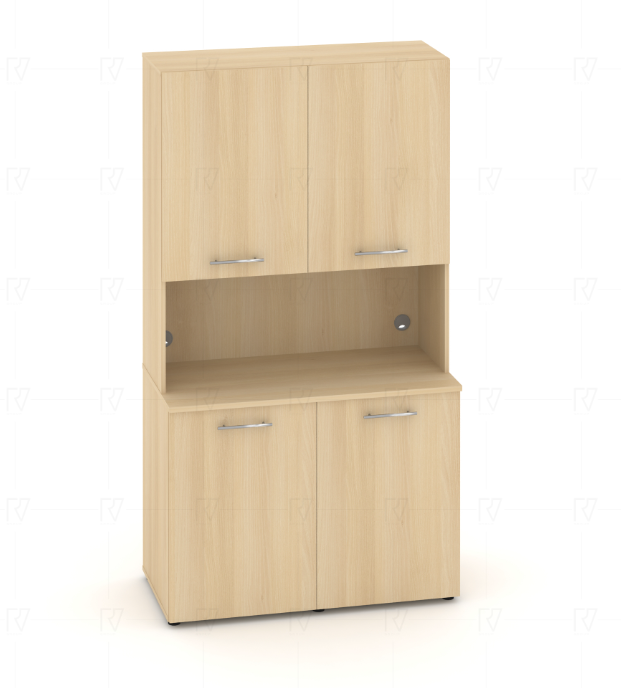 Фасады антресоли накладные, фасады тумбы накладные и вкладные под столешницу в кромке 2мм. тУстанавливаемые полки, с жестким креплением на рафиксы, являются съемными, перфорация на стойках под полки с шагом 64мм.