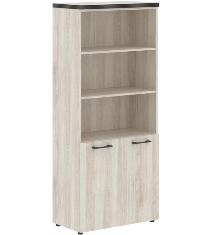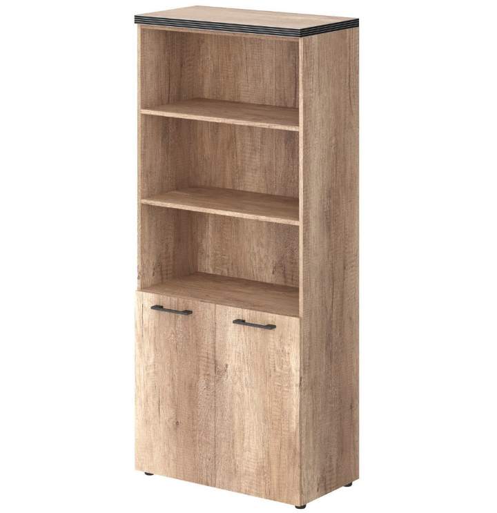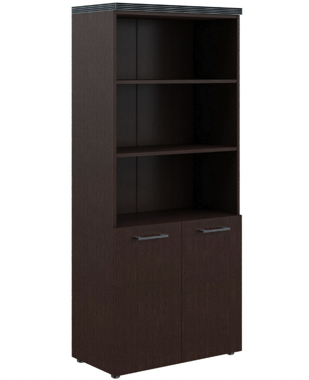 Солидный и широкий шкаф-стеллаж TORR для офисного или домашнего использования. Размеры - 854х1968х452 мм. Шкаф имеет солидный верхний топ 38 мм. Все торцевые поверхности основных элементов шкафа облицованы глянцевой акриловой пленкой 2 мм с декоративными полосками внутри кромки, что придает ей стильный 3D эффект. Торцы дополнительных элементов надежно защищены кромкой ПВХ 2 мм. Оснащен 5 полками, две нижние полки закрыты дверцами из ЛДСП, три верхние – открыты. На дверцах установлены долговечные и стильные металлические ручки. Конструкция шкафа оснащена прочными силовыми креплениями – эксцентриковыми стяжками. Регулируемые по высоте опоры обеспечат шкафу устойчивость на неровном полу.