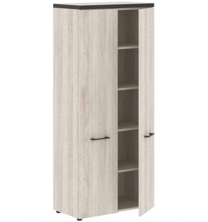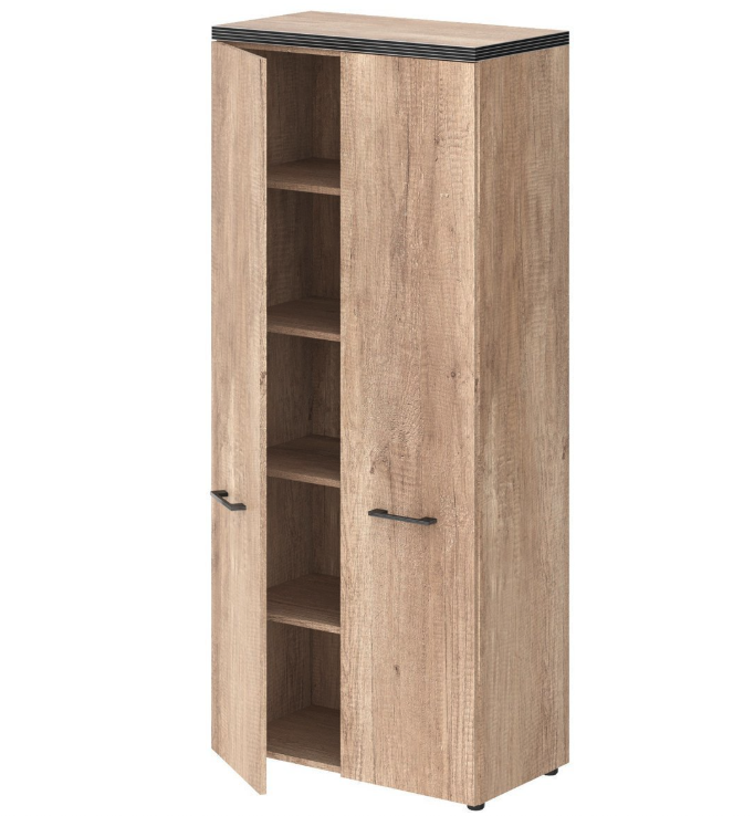 Солидный высокий и широкий шкаф TORR для офисного или домашнего использования. Размеры - 854х1968х452 мм. Шкаф имеет прочный и долговечный верхний топ 38 мм. Все торцевые поверхности основных элементов шкафа облицованы глянцевой акриловой пленкой 2 мм с декоративными полосками внутри кромки, что придает ей стильный 3D эффект. Торцы дополнительных элементов надежно защищены кромкой ПВХ 2 мм. Двустворчатый шкаф оснащенный 5 просторными полками, которые закрываются дверцами из ЛДСП. На всех дверцах имеются долговечные и стильные металлические ручки. Конструкция шкафа оснащена прочными силовыми креплениями – эксцентриковыми стяжками. Регулируемые по высоте опоры обеспечат шкафу устойчивость на неровном полу.