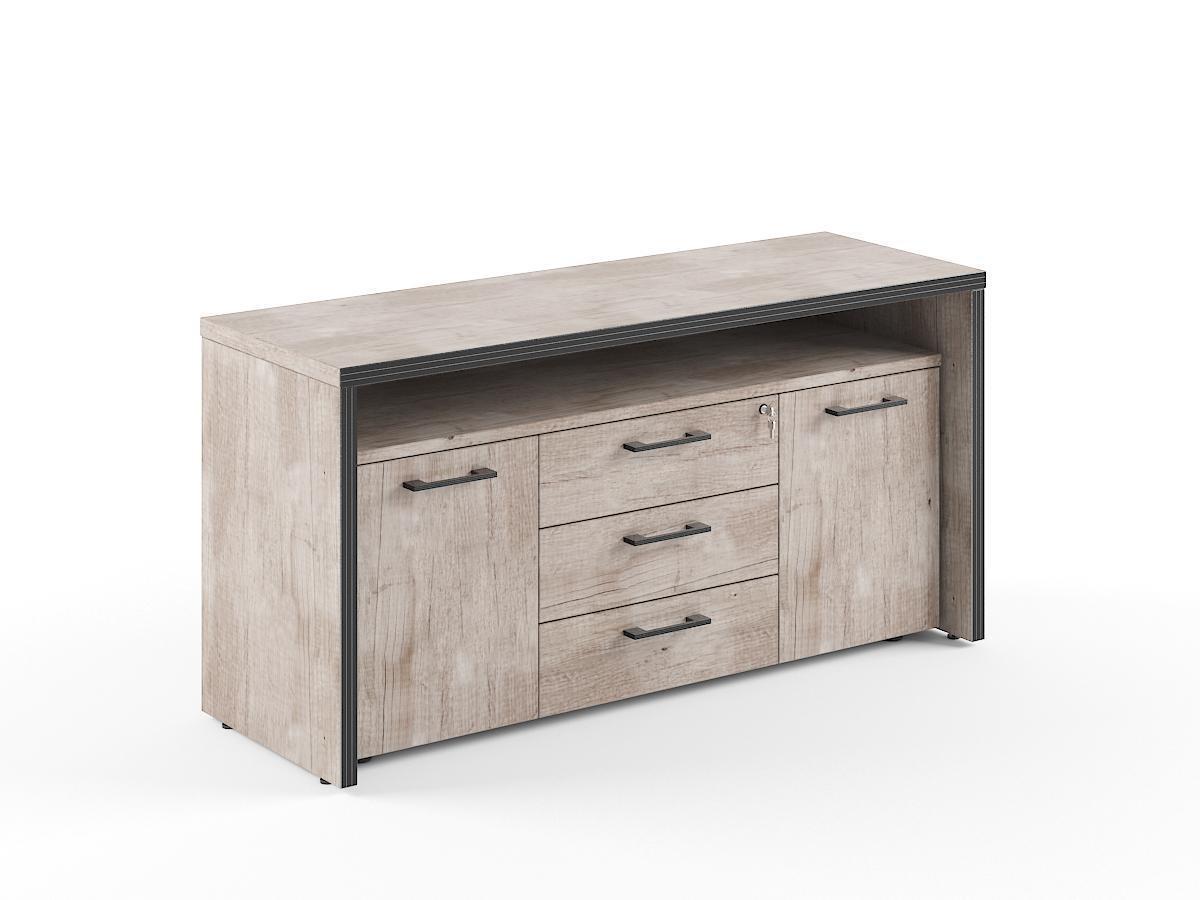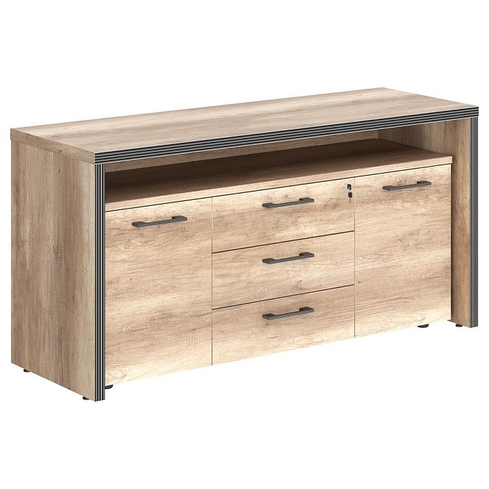 Современная тумба с фригобаром TORR для офисного или домашнего использования, размер - 1640х800х550 мм. Тумба имеет солидный верхний топ 38 мм. Все торцевые поверхности основных элементов тумбы облицованы глянцевой акриловой пленкой 2 мм с декоративными полосками внутри кромки, что придает ей стильный 3D эффект. Торцы дополнительных элементов надежно защищены кромкой ПВХ 2 мм. Тумба оснащена 3 ящиками с центральным замком и двумя боковыми секциями предназначенными для фригобара. Конструкция тумбы оснащена прочными силовыми креплениями – эксцентриковыми стяжками. Регулируемые по высоте опоры обеспечат тумбе устойчивость на неровном полу.