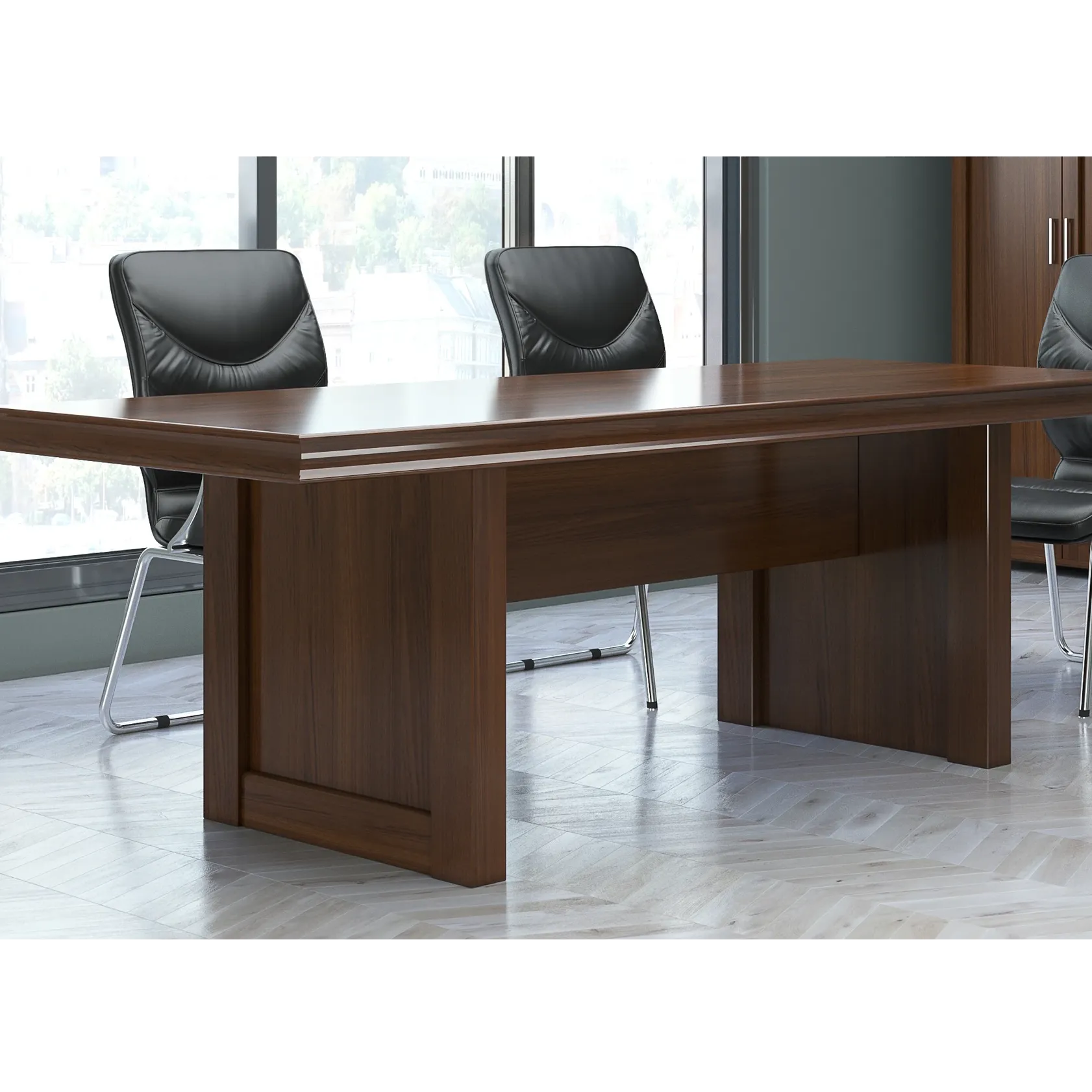 - Все фасады, столы и брифинг-приставки облицованы шпоном FINE LINE, тонированным в «тёмный орех» и покрыты полиуретановым лаком по технологии «открытые поры» — подчёркивая природную структуру дерева, сохраняя его дыхание и глубину.