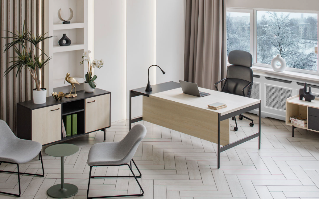 Светлый дуб столешницы мягко контрастирует с глубоким графитовым оттенком — не как противоположности, а как сбалансированные элементы одной идеи. Матовые антрацитовые металлические опоры не просто поддерживают форму — они архитектурно завершают композицию, подчёркивая чистоту линий и отсутствие лишнего.